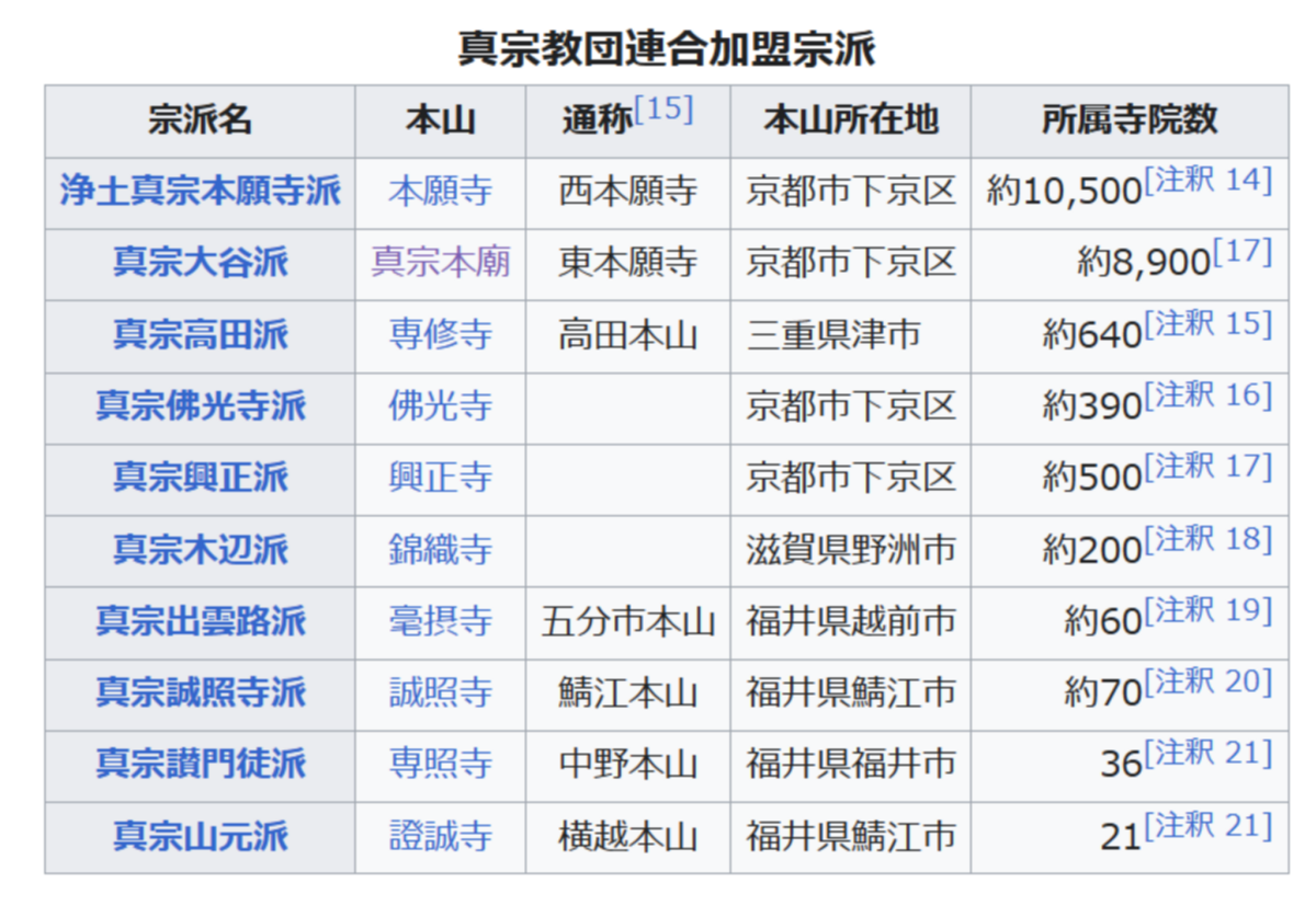 現在、本願寺派〈西本願寺〉の末寺・門徒が、中国地方に特に多い〈いわゆる「安芸門徒」など〉のに対し、大谷派〈東本願寺〉では、北陸地方・東海地方に特に多い〈いわゆる「加賀門徒」「尾張門徒」「三河門徒」など〉。また、別院・教区の設置状況にも反映されている。このような傾向は、東西分派にいたる歴史的経緯による。